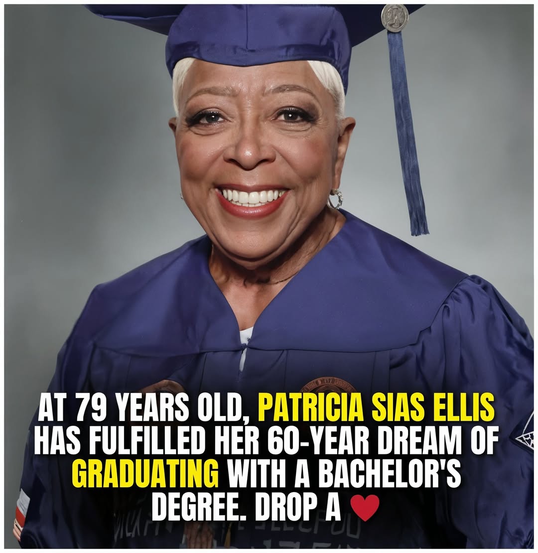 At 79 years young, Patricia Sias Ellis walked across the stage in her deep blue graduation gown, white hair glowing under the lights, and claimed the bachelor’s degree she had dreamed of for sixty years. Her inspiring story of perseverance, courage, and lifelong learning has touched hearts worldwide — proving that it’s never too late to chase your dreams.