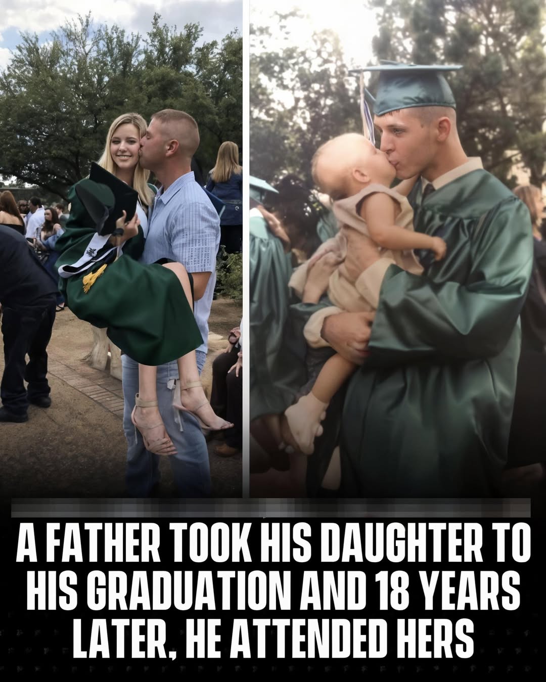 Eighteen years ago, on his college graduation day, a young father in his green cap and gown lifted his tiny baby daughter high above his head. He pressed a tender kiss to her chubby forehead, sealing a promise he didn’t yet fully understand — the promise to love her, protect her, guide her, and cheer for her through every chapter of life. Captured forever in that single frame: his broad, joyful smile, her innocent little face, and a future stretching wide and bright ahead.