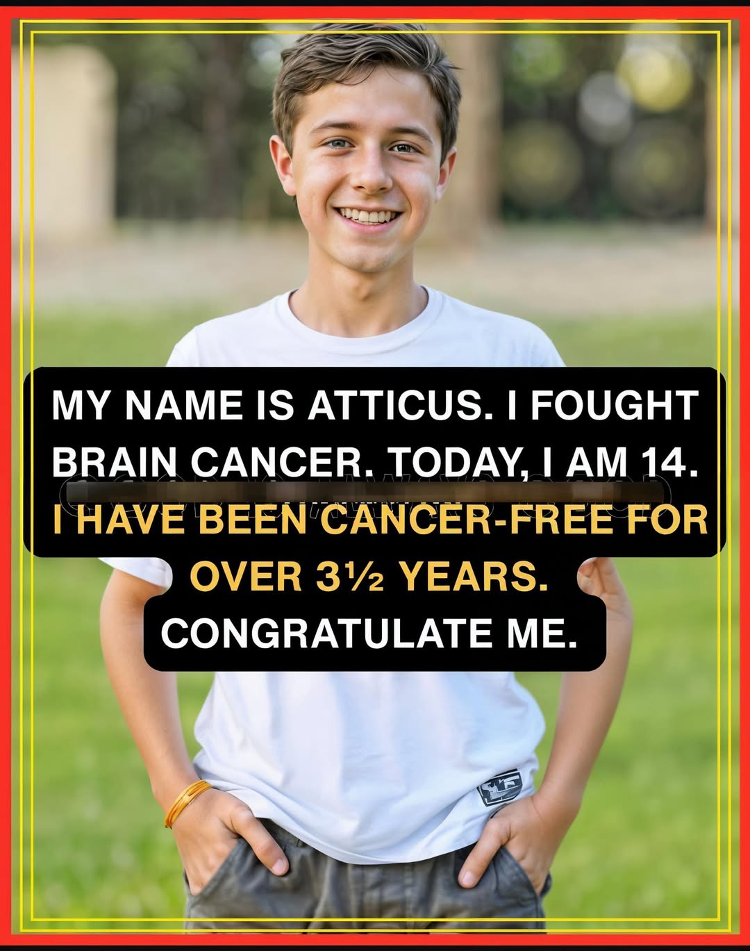 In the golden light of a peaceful afternoon, 14-year-old Atticus stands tall on the grass, his bright smile lighting up the world brighter than the sun itself. Three and a half years ago, brain cancer tried to steal his future — filling his days with hospitals, scans, treatments, and the heaviest kind of courage a child should ever have to carry. But Atticus fought back with everything he had. He never stopped dreaming. He never stopped laughing. He never stopped believing he would win.