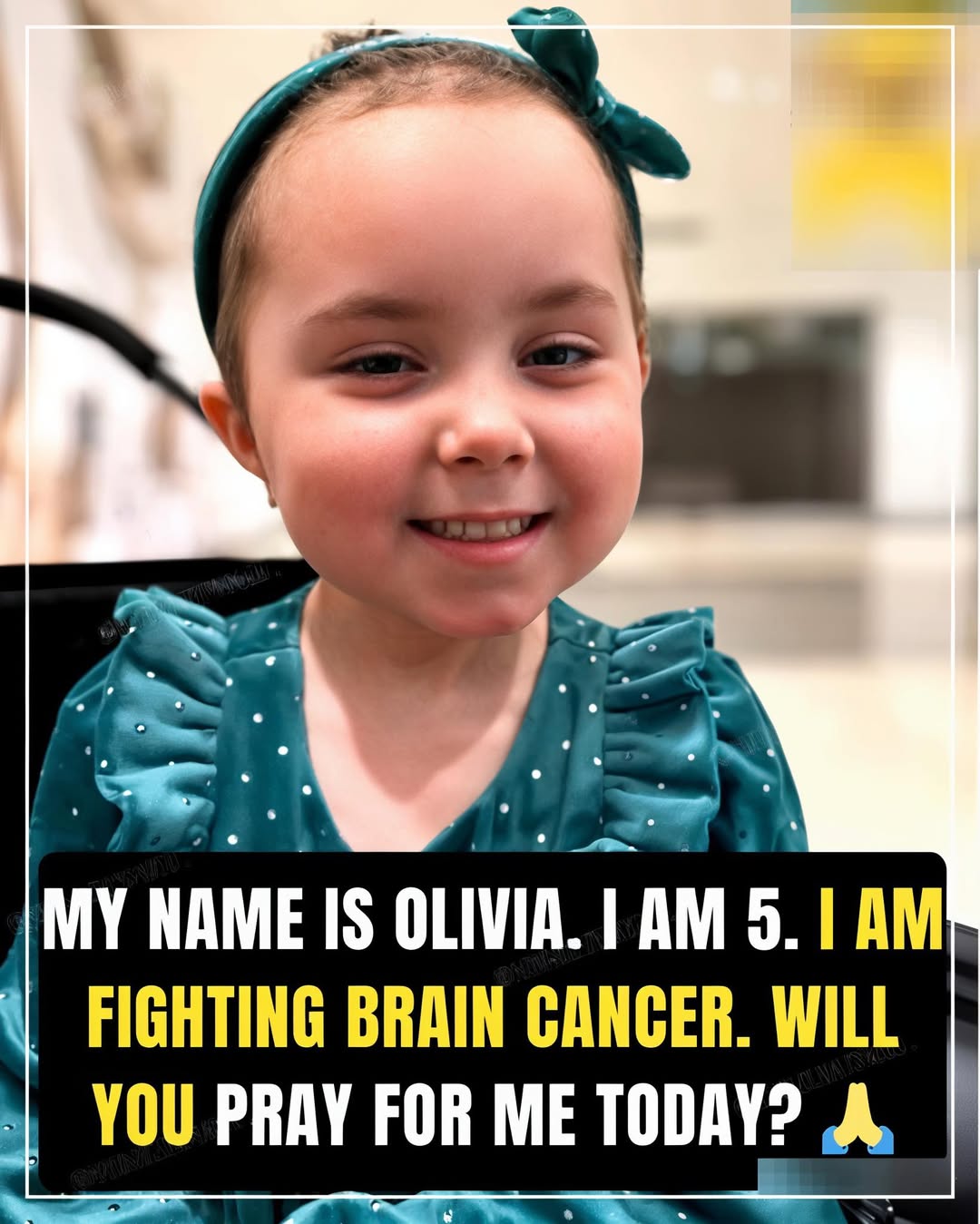 In the bright, open space of a hospital atrium filled with soft echoes, five-year-old Olivia sits with perfect poise, her teal headband and sweet bow framing a face full of gentle strength and sparkling hope. At just five years old, she carries the heavy name of brain cancer with the lightest, most trusting smile. Her big brown eyes look straight into the camera as if speaking directly to every kind heart watching.
