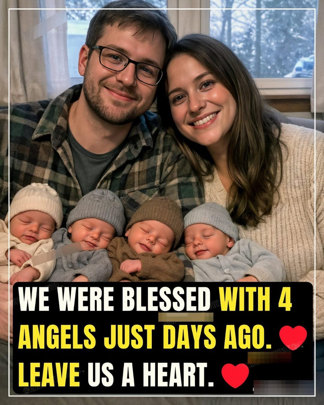This heartwarming moment captures the pure magic of welcoming quadruplets: the father’s proud grin, the mother’s gentle, glowing face, and four little ones resting peacefully against their parents, tiny hands curled in trust. The quiet winter light filtering through the window adds a soft, serene touch to the scene, making the photo feel like a living celebration of love multiplied beyond imagination.