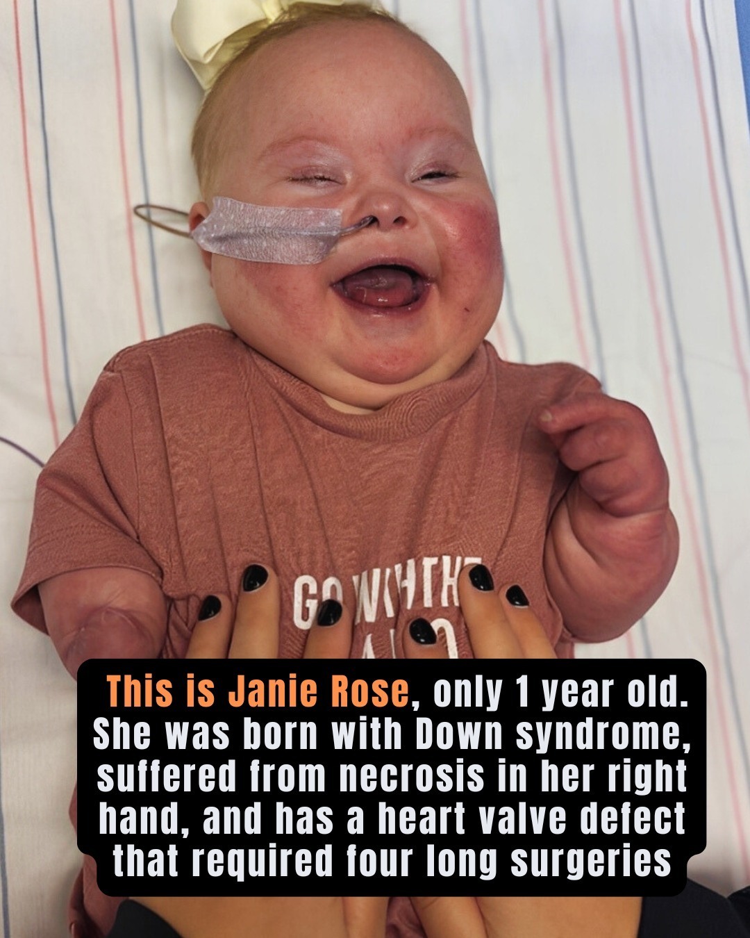 At just one year old, little Janie Rose has already lived a story that would challenge even the strongest hearts π. From the very beginning, her life has been marked not by ease, but by courage, resilience, and a spirit far bigger than her tiny hands. Born with Down syndrome, Janie entered the world with an extra chromosome β and with it, a journey filled with medical battles no baby should ever have to face.