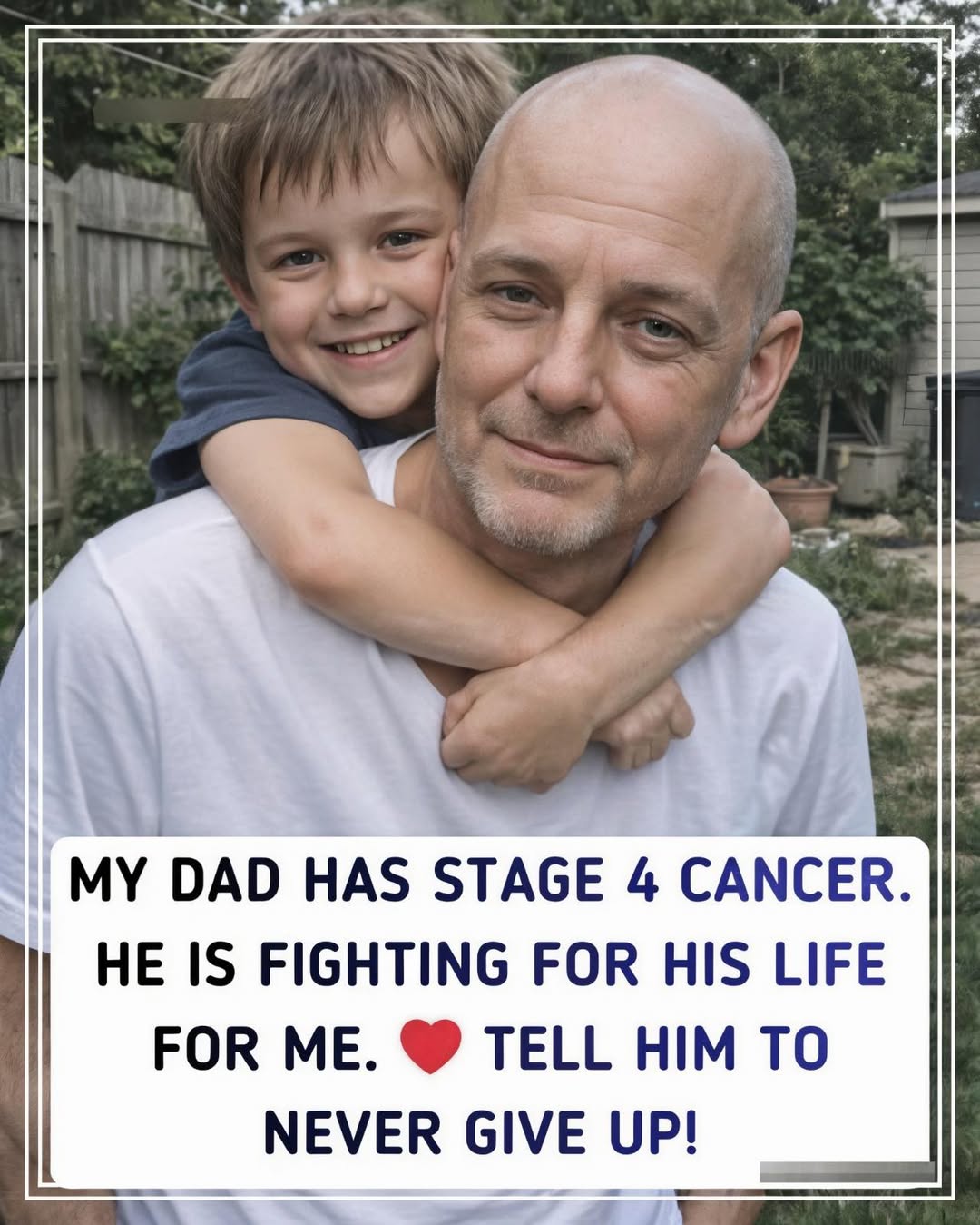 In a quiet backyard bathed in golden afternoon light, a little boy clings tightly to his dad’s shoulders, small arms wrapped around the strong neck of the man who has always been his hero. The father — bald from the fierce battles of stage 4 cancer — smiles softly, eyes still sparkling with the same fierce love he’s carried since the day his son was born.