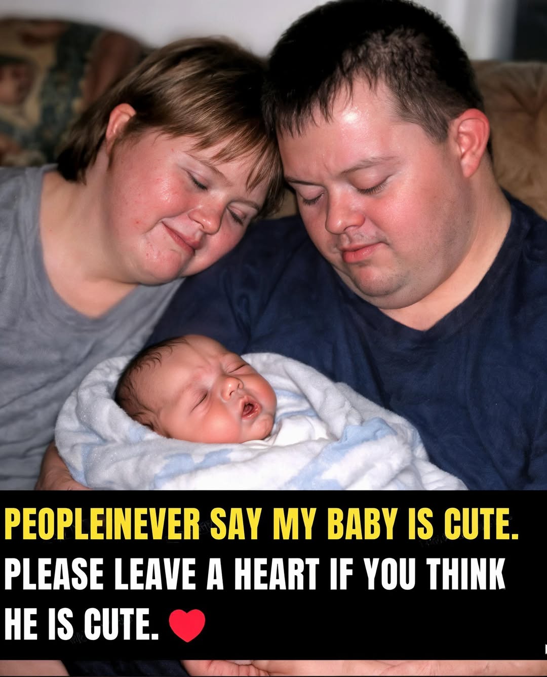 In a world that sometimes overlooks differences, one family’s tender moment has captured hearts everywhere — a young brother and sister with Down syndrome cradling their newborn sibling, their heads resting together in quiet adoration. The baby’s tiny face is scrunched in that perfect newborn pout, wrapped snugly in a soft blue-and-white blanket, safe in the protective circle of their arms. This beautiful photo, shared by a loving mother, carries a simple yet powerful plea: “People never say my baby is cute.”