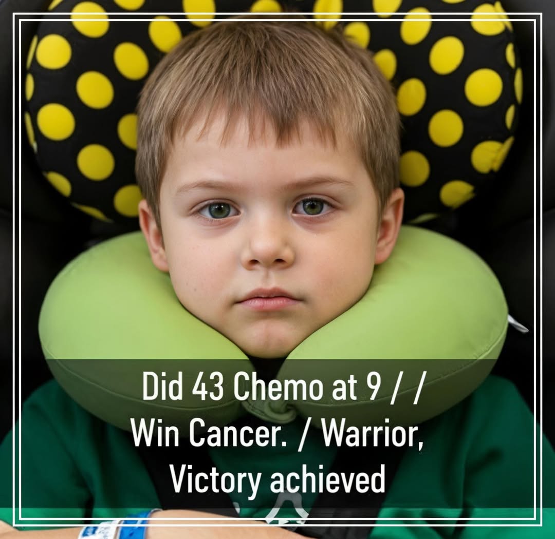 In the quiet comfort of a colorful room, a nine-year-old boy — the bravest warrior — rests his head against a bright green travel pillow dotted with cheerful yellow spots. His small face is calm and proud after the longest battle of his young life. With his head smoothly bald from 43 rounds of chemotherapy, he gazes straight ahead with steady green eyes that hold the quiet strength of someone who has faced fear head-on and won.