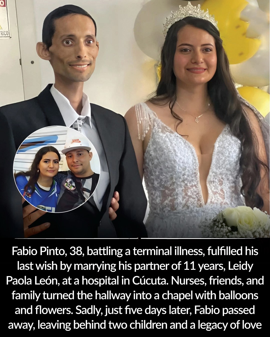 In the quiet corridors of Erasmo Meoz University Hospital in Cúcuta, Colombia, a love story unfolded that the world will never forget. In his final days, 38-year-old Fabio Pinto made a decision that cut through pain, fear, and time itself — he wanted to marry the woman who had been his home for 11 years, Leidy Paola León. 💍❤️