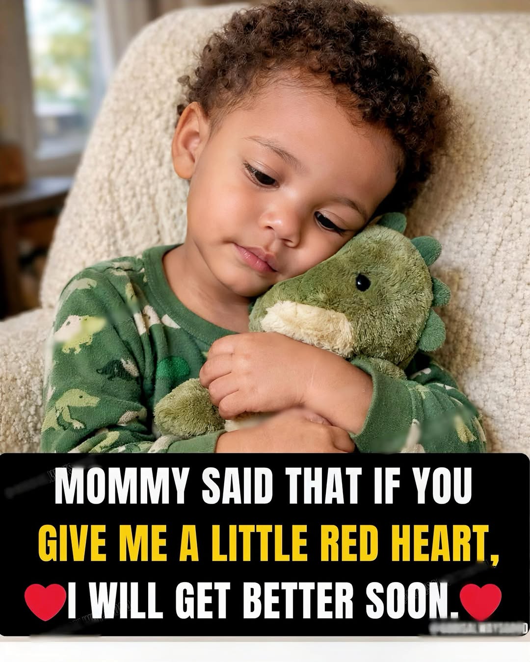 Curled up snugly on a soft armchair bathed in gentle morning light that feels like a warm hug from the sun itself, precious toddler with bouncy curly hair clutches his favorite green dinosaur plushie tightly to his chest like it’s the safest place in the universe. Mommy said that if you give him a little red heart, he will get better soon — and those words, spoken with all the love only a mother can give, have turned a simple emoji into the most powerful wish for healing imaginable.