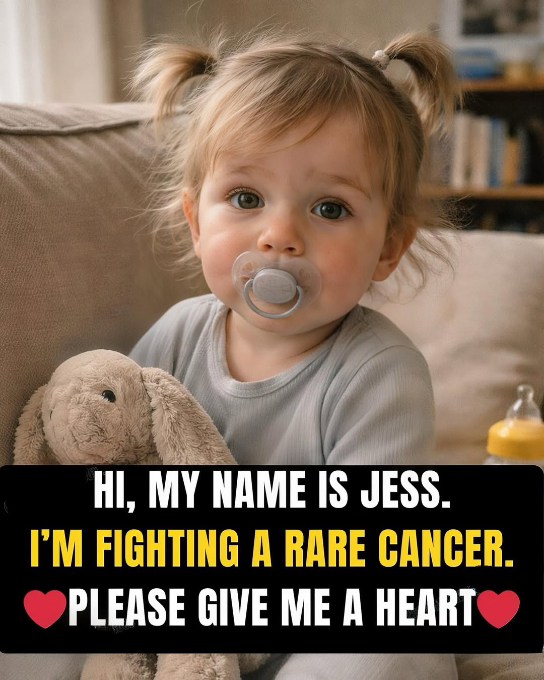 “Hi, my name is Jess. I’m fighting a rare cancer,” she shares through her soft pacifier, her voice so small yet incredibly strong, like a whisper that carries farther than any shout. Her adorable double ponytails — tied with little bows that match her brave spirit — frame a face radiating pure sweetness even on the hardest days. Clad in cozy gray pajamas that make her look like a soft little cloud, she holds her beloved fluffy bunny close, finding comfort in its floppy ears while bravely facing treatments no child should ever know.