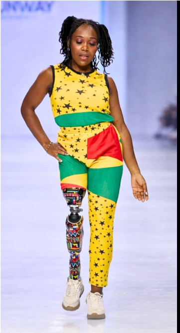 There, she made another powerful choice — to wrap her prosthetic leg in kente, a traditional Ghanaian fabric rich with symbolism, heritage, and pride. Kente is often associated with royalty, identity, and celebration. By incorporating it into her prosthetic, Abena fused disability and culture into a single visual statement: both are part of who she is.