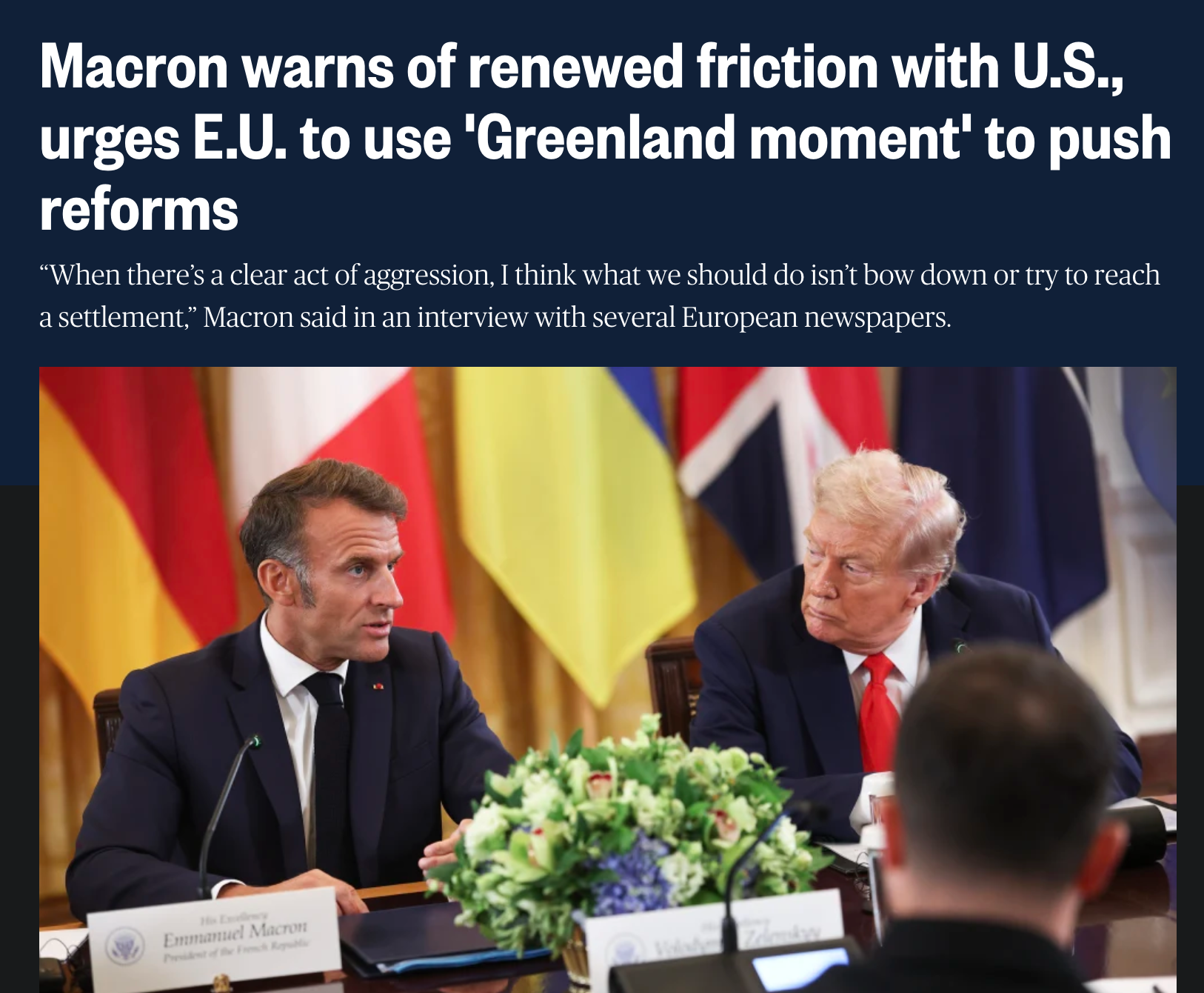 Macron referenced renewed tensions surrounding Greenland, after President Donald Trump revived controversial rhetoric about U.S. control over the Arctic territory.