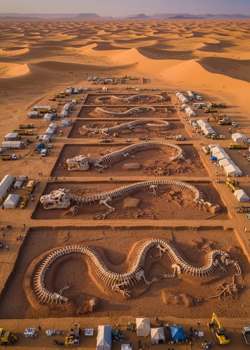 A stunning aerial image from a vast desert excavation has sent shockwaves across the internet, captivating the global imagination. Massive trenches carved into the arid landscape reveal colossal skeletal forms—some serpentine, while others defy categorization entirely—laid out with an eerie precision across the shifting sands. This unprecedented discovery has drawn teams of researchers equipped with state-of-the-art technology, transforming what was once a barren terrain into the center of intense scientific inquiry and public fascination.