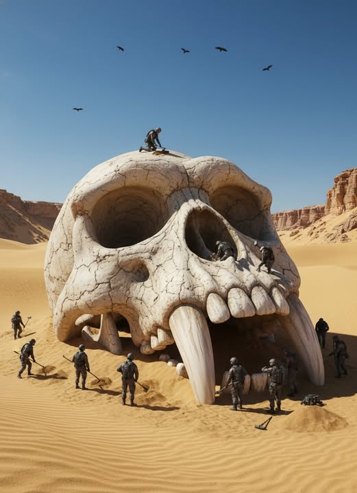A colossal, razor-fanged skull has burst onto the global stage, captivating attention and igniting controversy after being unearthed from beneath the windswept sands of a remote desert. This astonishing discovery has left archaeologists stunned and the internet buzzing with speculation. Towering over the excavation team, the skull’s enormous curved fangs and cavernous eye sockets showcase an unnervingly intact structure that raises far more questions than it answers.