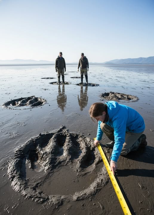 A remote shoreline has become the epicenter of global fascination and intrigue, capturing the attention of scientists, historians, and curious onlookers alike, after a series of enormous, perfectly defined footprints emerged beneath the retreating tide. Each print is so massive and spaced with such extraordinary precision that experts on site are left scrambling for explanations, acknowledging that they are grappling with something that defies current understanding.