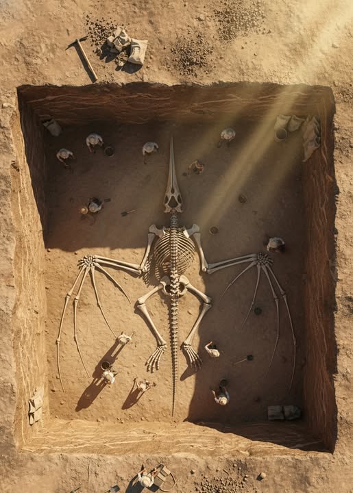 Deep beneath the shifting sands of the desert, a groundbreaking discovery has left the scientific community utterly stunned: the fossilized skeleton of a colossal winged creature, its vast wingspan dwarfing the excavation pit itself. This awe-inspiring find challenges everything we thought we knew about the history of life on Earth, as each carefully unearthed bone hints at a being so extraordinary that it seems to have stepped straight out of ancient lore.